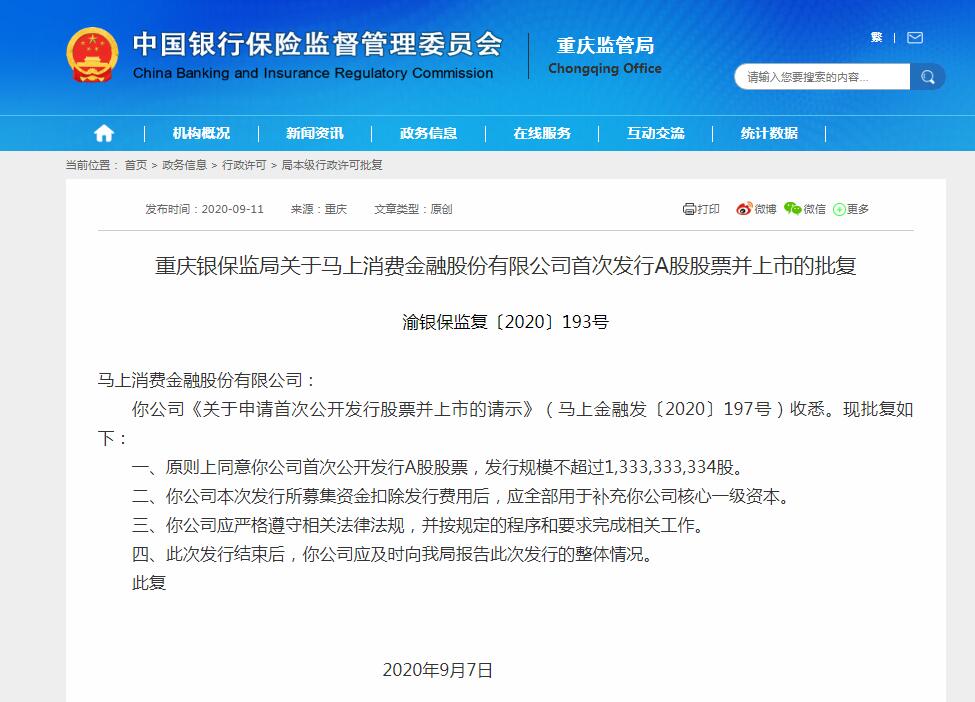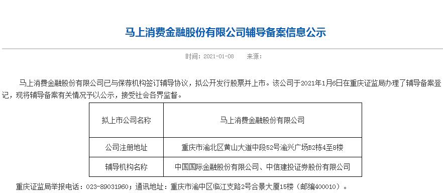 2020年9月11日,重庆银保监局批复,同意马上消费金融首次公开发行A股股票,发行规模不超过13.33亿股。今年1月8日,重庆证监局公示马上消费金融辅导备案信息公示,称马上消费金融已与保荐机构签订辅导协议,拟公开发行股票并上市,保荐机构为中金公司和中信建投。