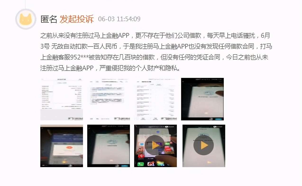 除此以外,还有多名用户投诉称并未在马上消费金融平台借款,却被无故扣款。如6月2日,一位匿名用户称“我没有在马上消费金融上面贷款,6月2号上午在我的建行银行卡里扣除了883.62元”。6月3日,另一名用户投诉称其的尾号3478农行储蓄卡无故被马上消费金融扣款800元,要求退回。此后,在该投诉事件的进展中,马上消费官微申请完成投诉,表示已与用户沟通并达成一致。但该用户又补充投诉称“没有和我达成一致,一点没有和我协商的意思,他们平台说什么就是什么。”同在6月3日,还有用户投诉表示“之前从来没有注册过马上金融APP,更不存在于他们公司借款,每天早上电话骚扰,6月3号无故自动扣款一百人民币,于是我注册马上金融APP也没有发现任何借款合同,打马上金融客服被告知存在几百块的借款,但没有任何的凭证合同,今日之前也从未注册过马上金融APP,严重侵犯我的个人财产和隐私。”