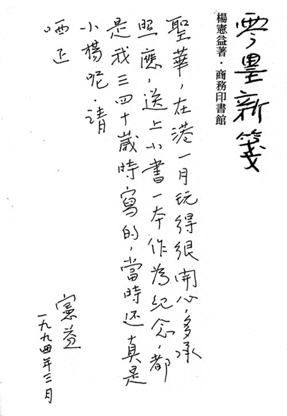留港一月,杨宪益伉俪除了举办讲座,出席活动,也遇见了不少旧雨新知,例如在中大跟饶宗颐、劳思光等学者会面,欢谈合影;在空余时间重晤旧友黄永玉。更有一回,由我们夫妇带着他们到香港的黄金海岸去消磨了一个下午。那个月,虽然因为中大访客众多,接待的客舍供应紧张,两老无奈给逼迁了三次:从新亚会友楼,到大学曙光楼,再到逸夫雅群楼,他们仍然安之若素,毫无怨言,小杨甚至还为此赋诗遣怀:先说“故旧重逢会友楼/主人盛意更无传”(会友楼);再说“宾馆室雅何须大,小住三天亦是缘”(曙光楼);最后则叹曰“一弯浅水雾迷濛/楼外青山似梦中/昨夜东风春乍暖/校园处处杜鹃红”(雅群楼)。