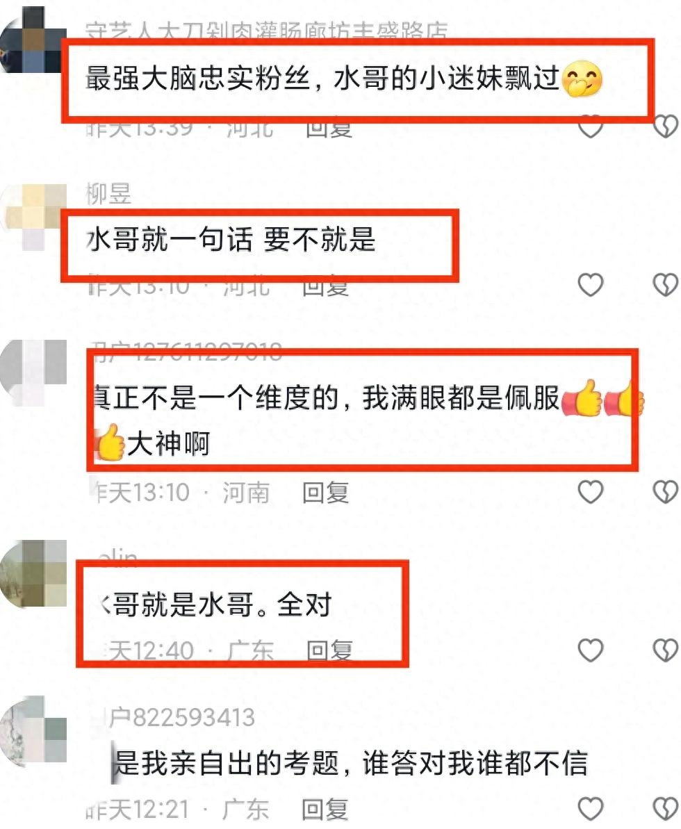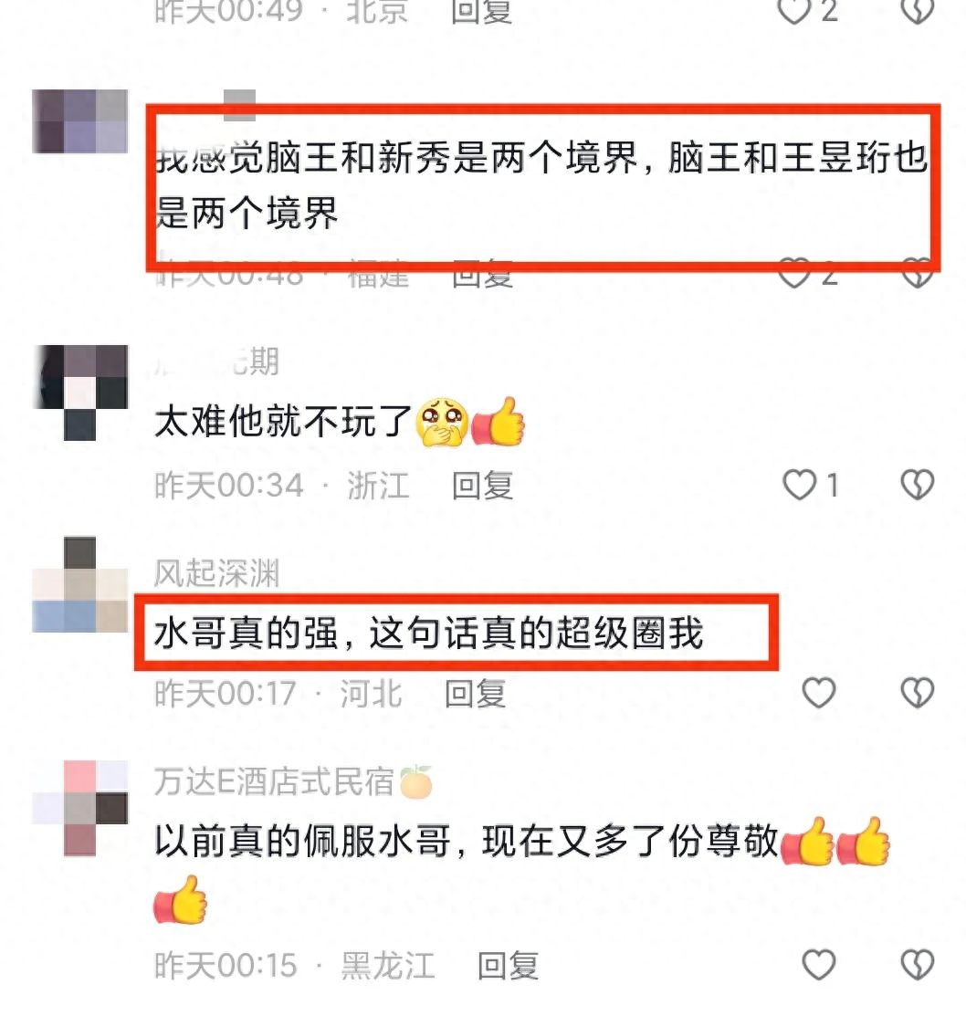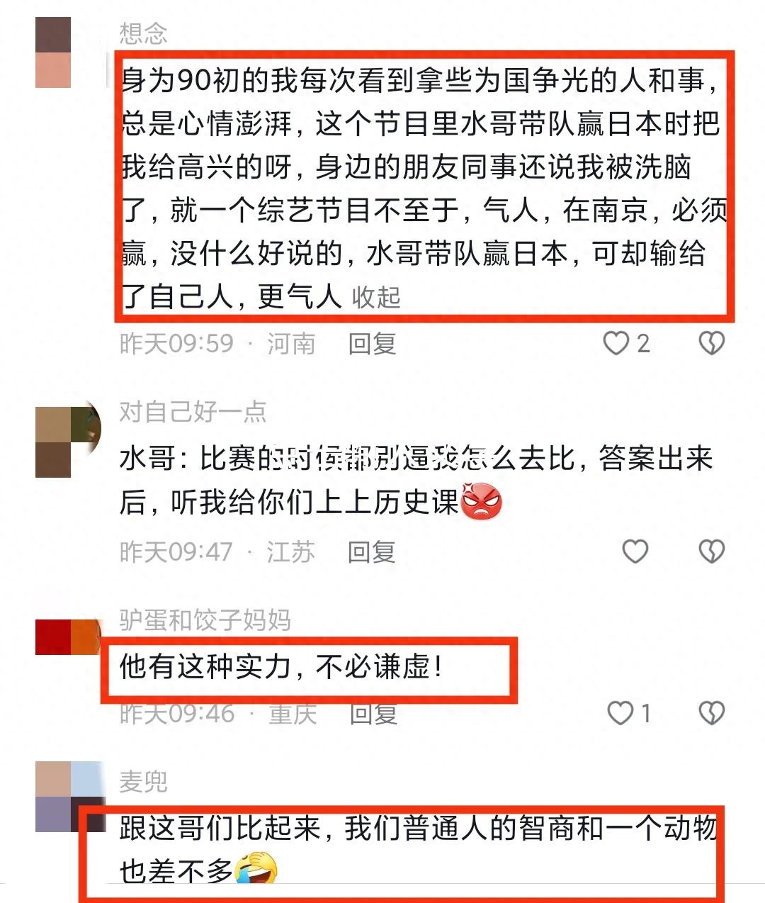 综合以上几场比赛可以上看出,水哥的实力是毋庸置疑的,要不然也不能从这么多场比赛中狂虐对手,一而再再而三的赢得胜利,水哥身上的特点很明显,前期,狂妄霸气,桀骜不驯,我行我素对战日本队时足智多谋,三观很正。现如今颜值逆天一表人才,品貌非凡有内涵,有气质。这就是许多网友,喜欢他重要的原因被奉为神一样的男人!再看看网友最新的评价吧!眼见为实。