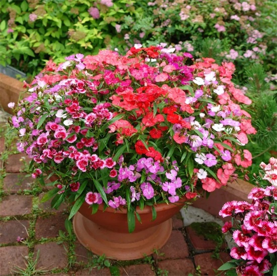 石竹花是非常可爱的多年生植物,它们的花色一般是粉色、红色或白色的,石竹花的花色看起来都是比较鲜艳的迷人的。它的花期是在春末到秋季,在夏季过度高温的时候花量就会减少。石竹花的植株高度一般就长到30多厘米,植株会长得比较紧凑,很适合养成盆栽观赏植物。