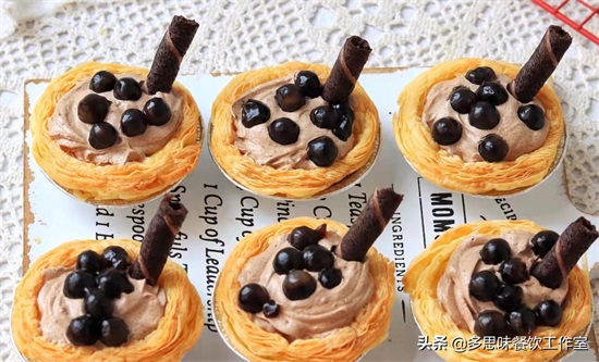 4馅料装入裱花袋,挤在蛋挞表面,装饰黑糖珍珠和蛋卷就完成啦,高颜值又好吃,答应我一定要试试看,给你带来惊喜哟。