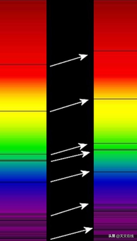 遥远星系超星系团光学光谱中的吸收线(右)与太阳光谱中的吸收线(左)相比较 箭头表示红移 波长向红移及以上方向增加(频率减小)