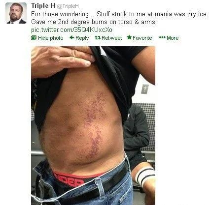 赛后Triple H也在网络上晒出了自己被冻伤的照片。