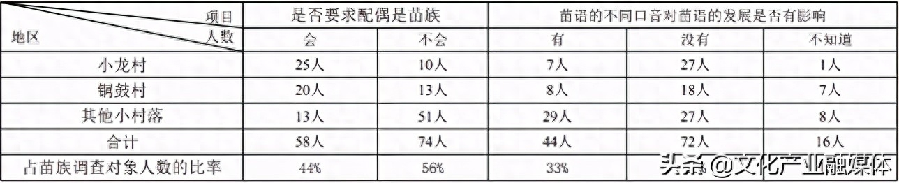 苗族调查对象当中,56%的人“不会”要求配偶是苗 族。各民族间的通婚会影响家庭成员说苗语的情况,可能会 导致苗语汉化。但保守地要求配偶是苗族并非是保护苗语的 根本解决方法。关于苗语的多种口音问题,33%的苗族人认 为苗语的不同口音对苗语的发展“有”影响。其原因可能是 因为苗语口音不同而选择用汉语代替苗语的话会导致部分 苗语丢失[1]。在聚集区内关于人们对苗语重视程度的认知当 中,认为“重视”的人仅有37%,而11%的人没有太大感触, 而认为“忽视”的人达到51%,苗语的重视程度令人堪忧。