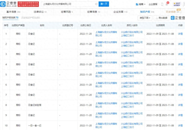 现代快报记者获悉,11月20日,上海罐头场文化传播有限公司新增多项知识产权出质。出质知产类型为商标,一共有73件,名称包括“日食记”“日食记体验馆”“一日一食一记”,质权人为某银行,出质期限为2022年11月9日至2023年11月8日。