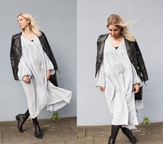 若只穿上松身连身裙,孕味或会太浓,一件皮衣消除孕味之余更添时代感。