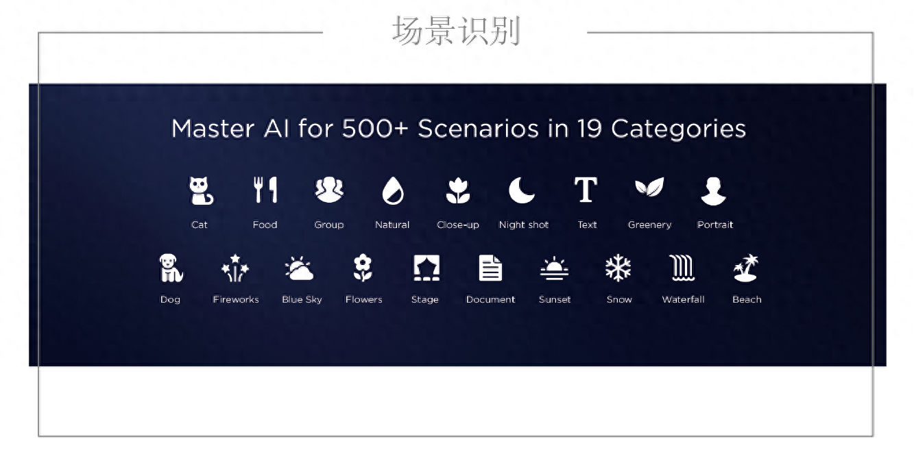 AI场景识别,实时识别拍摄场景,自动进行调校和参数设置,一景,一物,一算法,涵盖美食、宠物、日落等多达19种识别场景。