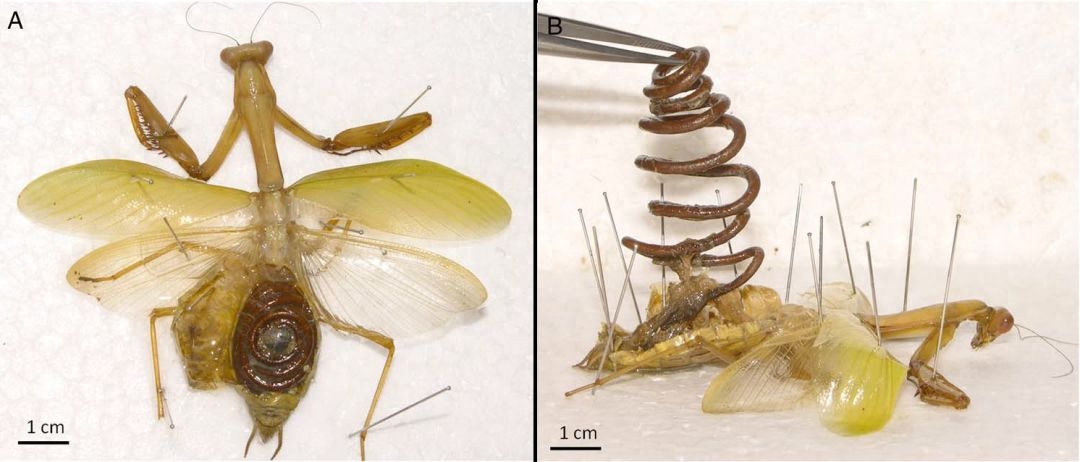 从这只被寄生的螳螂腹部,钻出来一条身长它3倍的铁线虫丨e-info.org