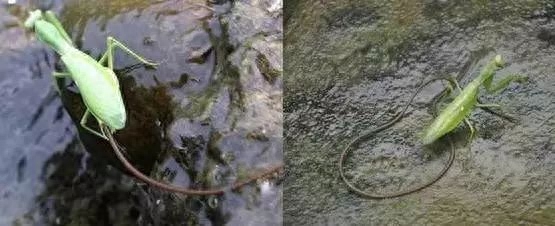 铁线虫的幼虫在水里生活,所以当螳螂腹内的铁线虫成熟时,必须要回到水中完成产卵的任务,这时铁线虫会驱使螳螂寻找水源并跳入水中淹死,然后它就会破腹而出进入水中。