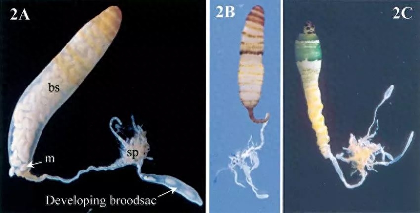 下次,假如你看到一只单眼或者双眼膨大跳动,呈现红黄绿等彩色条纹的蜗牛。你就知道,这只蜗牛其实已成玩偶,它的支配者,是许多只齐心协力的双盘吸虫。