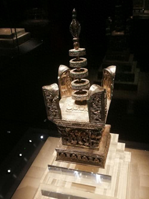 下方是一个鎏金的银盒,盒盖的做工极致精美细腻,单是双凤戏牡丹的花纹便足以惊呆众人,而盒子的四面,刻有“千秋万岁”字样,其字间距分布均匀,正楷书写,十分工整。在盒子的四面饰有佛祖故事题材的浅浮雕。四面是镂空的,透过这些镂空能看到里面有一块金制品容器,据说佛螺髻发就藏在这个容器里面。此外,还有一尊佛教宝物,鎏金纯银阿育王塔,它珍藏在佛塔地宫中,不仅能够长期保存,而且也有利于祈福。在鎏金银盒上还嵌有多件精美的银质饰品,这些饰品不单是精美的艺术品,更是历史悠久的文物,具有极高的历史文化考察价值。