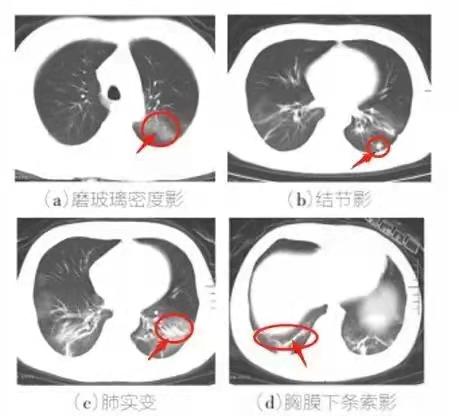 2.胸部CT特征:多发磨玻璃影、斑片影及实变影。