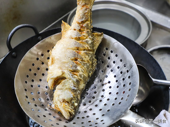 5.油温升至5成热,油面轻微冒烟时,转中小火把鲈鱼放入锅中炸3分钟,轻轻的晃动炒锅,不断的把热油浇在鱼身上让鱼均匀受热,鱼身两面呈金黄色时捞出控油。