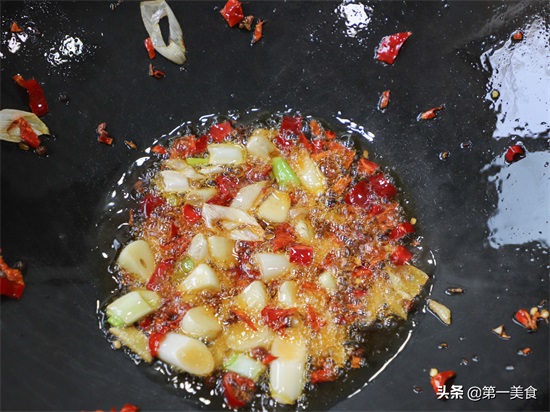 6.锅内留底油,油烧热以后撒入一小把花椒爆出香味,倒入切好的小料把小料炒香,加入豆瓣酱10克,豆豉5克增鲜,炒出豆瓣酱的红油,从锅边淋入适量的清水。
