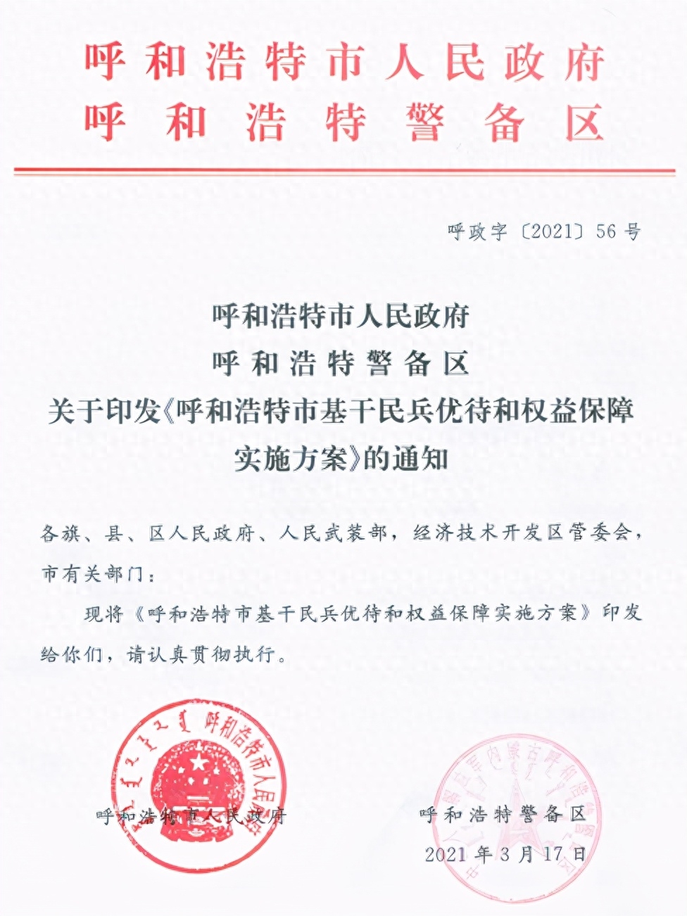3月11日,呼和浩特市印发《基干民兵优待和权益保障实施方案》,该市基干民兵将享有7项优先7项优待等福利。
