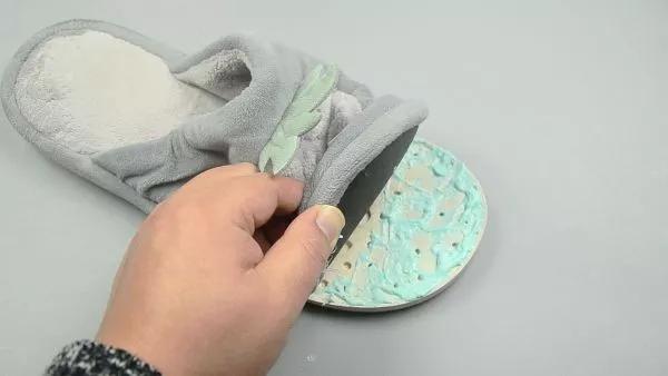 现在我们就来看一下,拿出已经开胶裂开的鞋子,用手撑开,再用干净擦布来回的擦拭,避免鞋子周边有灰尘,如果灰尘没有擦拭干净,就会影响到鞋子粘合的效果。擦拭干净鞋子之后,把裂开的鞋底撑开,然后拿来我们不用的牙刷或棉签,轻轻的蘸上一点万能胶,在我们用胶水涂抹时不要涂抹太多的胶水,这样开胶的地方不容易粘合,我们只要均匀的涂抹上去就可以了。