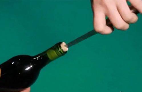 找一把有锯齿的刀子。将刀片扎入软木塞的中央,一手握住瓶颈,之后把小刀来回旋转扭动,慢慢地把软木塞转出来,然后将刀柄缓缓向上提起,慢慢拔出瓶塞。