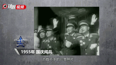 1955年10月1日的第七次阅兵是解放军实行军衔制后的首次阅兵。受阅部队指战员身穿55式军服,佩戴肩章、领章,军容严整地通过天安门广场。刚授衔的共和国元帅和大将们,在阅兵结束后,兴致很高地在天安门城楼上合影留念,这些照片成为开国将帅们着新军装、为数不多的珍贵图片,有的还成了将帅们的标准照。