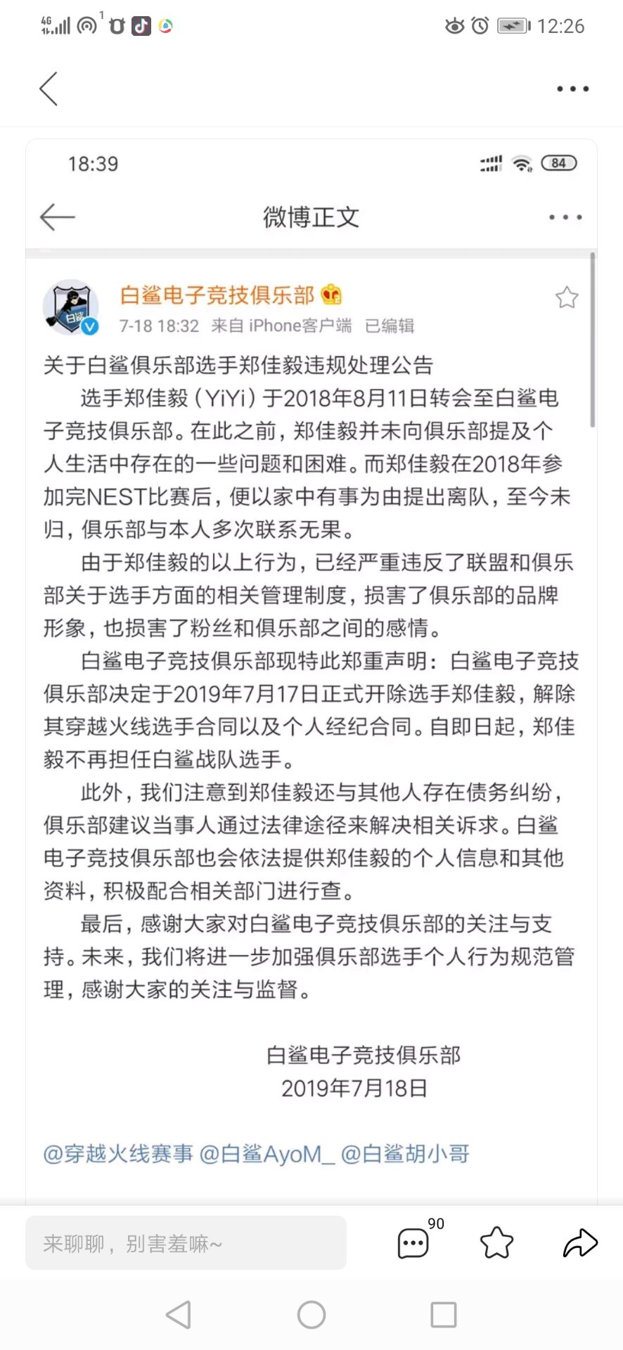 也就在前几日,白鲨战队的官方微博发布了公告,白鲨战队的主力狙击手(YIYI)正式开除。