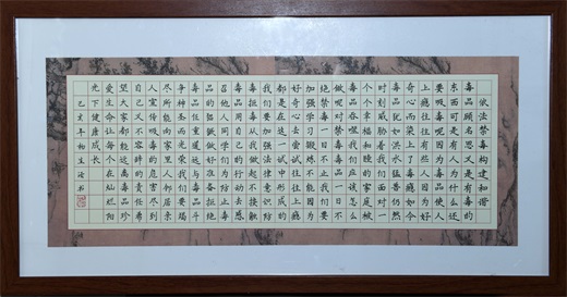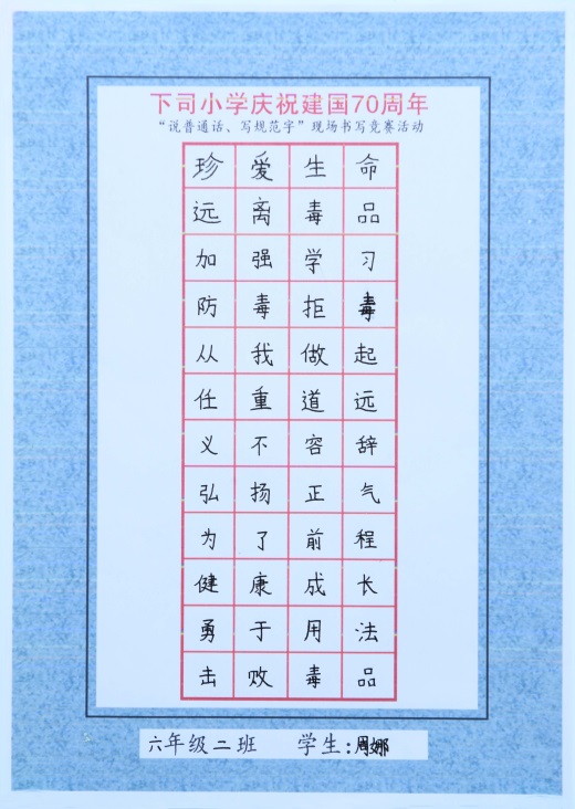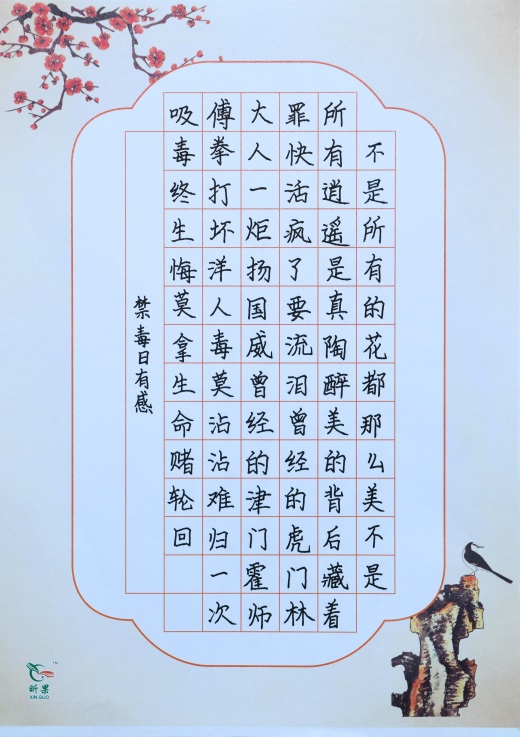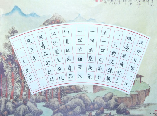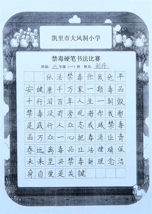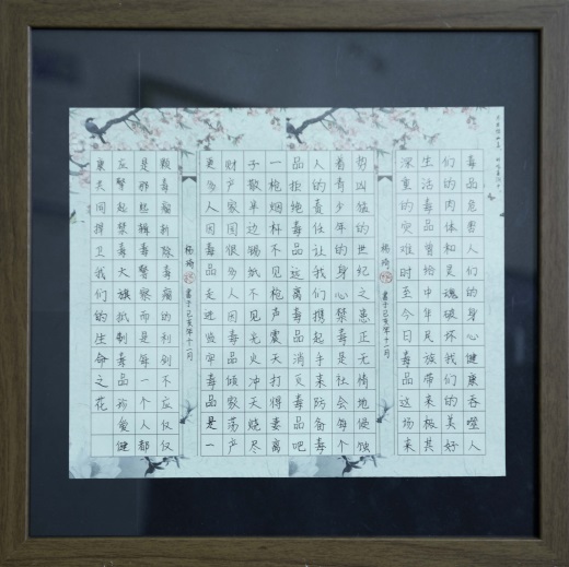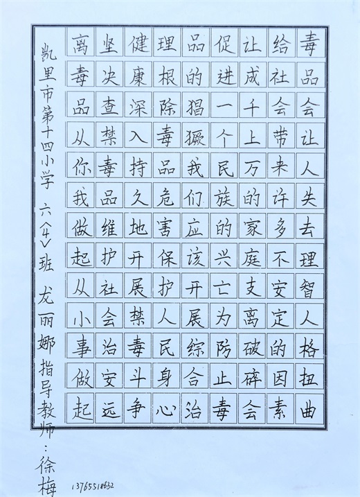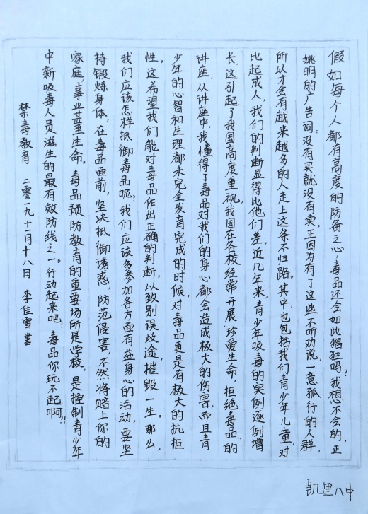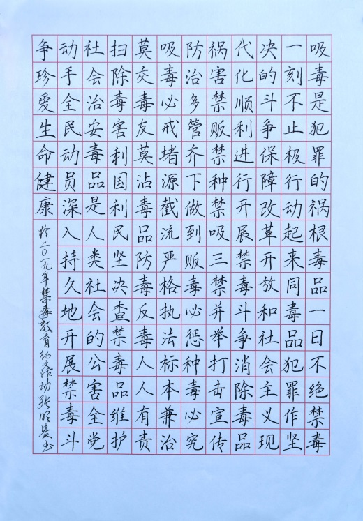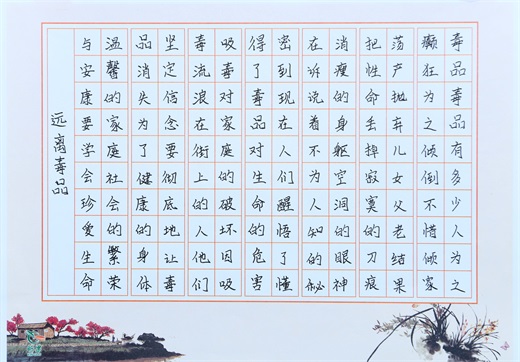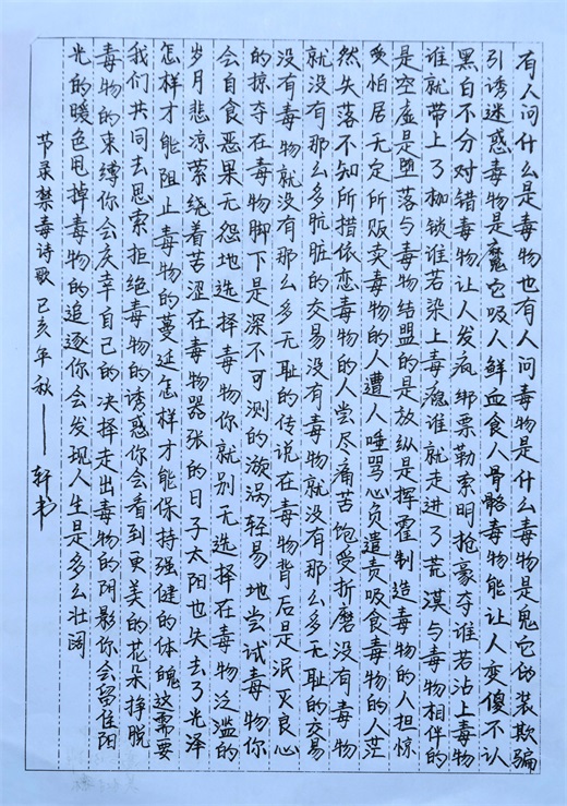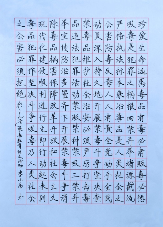 今天我们来欣赏学生们的硬笔书法作品,创新素养教育,让学生们在艺术中发现美,自觉接受毒品预防教育。在感受艺术美的同时,感知学生们的拒毒之心。