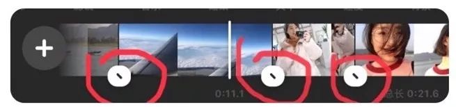 现在主题镜头剪切基本完成,但这时候有的镜头过度会很突兀,必要时我们需要设置转场特效,点击下图红笔划出的小白圈,让镜头过渡更加自然流畅。