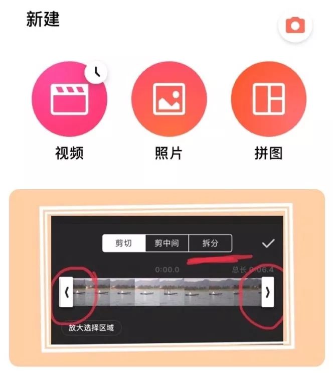 导入视频后就是剪切。点击最左边的剪刀图案可以拆分视频(把一段镜头分成两段镜头),或者拖动两侧箭头裁剪同一个镜头的多余部分,从而得到我们想要的内容。
