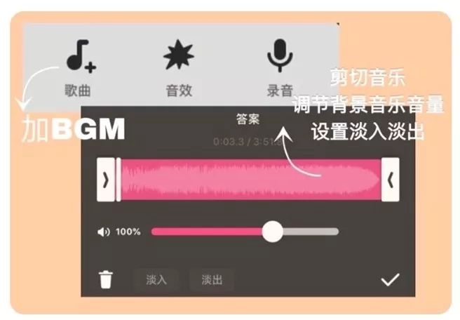 我是直接从 iTunes 下载到本地的音乐,添加后可以看懂粉红色音频图,推动两侧箭头可以实现音乐的剪切。点击淡入、淡出,让音频过渡不会特别突兀。