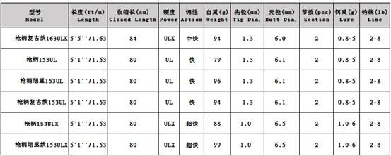 上图是一个马口路亚竿的参数表,其中很重要的一个参数就是硬度,由于马口个体较小,所以才用的路亚竿的硬度一般为UL,往下还有SUL或者ULK之类的。硬度往上走,如果手上有L硬度的杆子也可将就使用,再往上的ML就不推荐了,因为过硬的杆子会漏掉过多的咬口信息,从而无法预计刺鱼的时机,从而失去大部分鱼获。