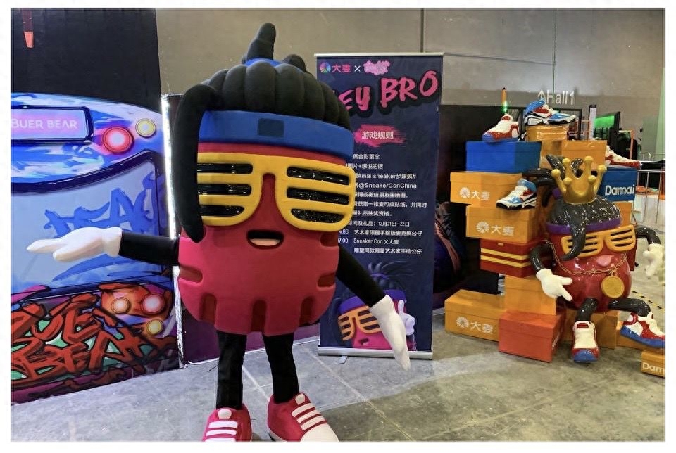Sneaker Con广州站里,作为联合承办方的大麦体育,现场与布尔熊一起搭建与潮流玩家沟通的展台,在大麦平台上购买「联名布尔熊套餐」的用户,可直接在展台兑换实物。