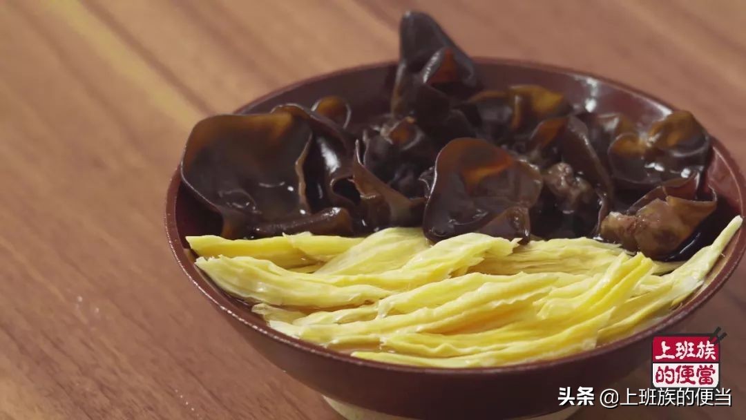 先来处理食材:木耳和腐竹提前用温水泡发;