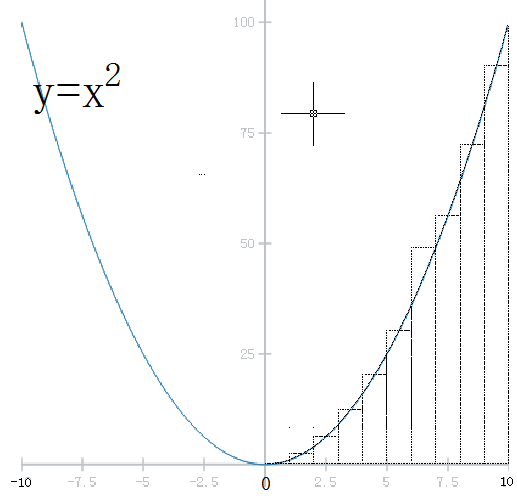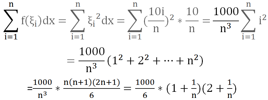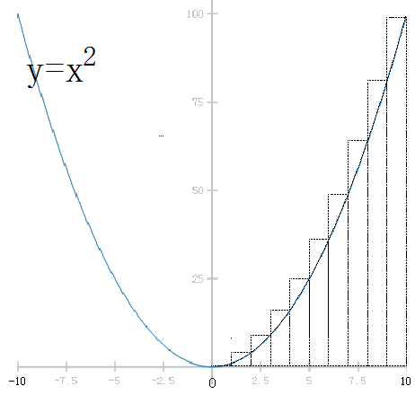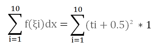 如果将区间[0,10]分成10个小区间,每个小区间的长度dx为1,在每个小区间[ti,tj]取点ξi(等于ti+0.5),每个dy=(ti+0.5)²,则将整个面积划分为10个长方形: