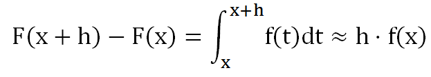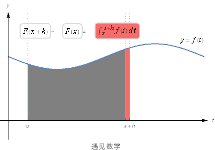 上图淡红色的阴影部分, 当 h 很小的时候几乎为小竖条, 所以可以用计算长方形面积的方法来估算该竖条的面积, 它的底从x 到x+h, 高从0 到f(x), 所以面积是 h*f(t) , 也就是: