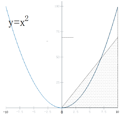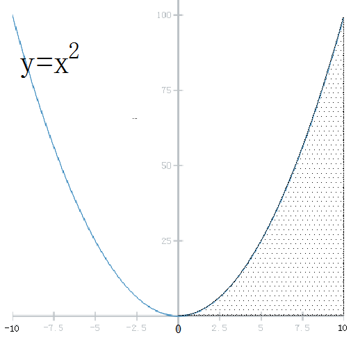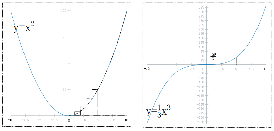 x²的反导数为1/3x³,所以上述所需求出的面积为:F(10)-F(0)=1000/3。