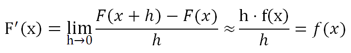 表达式h·f(x)就是面积函数F(x)的微分,函数的微分/自变量的微分称为微商,也称为导函数或导数,用F‘(x)表示。导数的形式在一定情形比微分的形式更简洁,微分也可以由导数迂回求得,如上式可有如下推导: