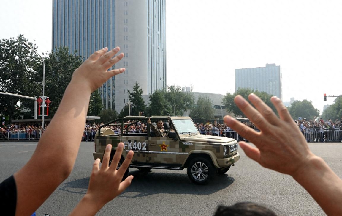 下图,大阅兵乘车收阅的我军身着新式星空迷彩手握新式突击步枪的战士,注意服装的打开样式