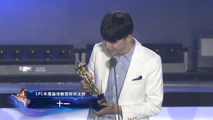 LPL解说界男解说颜值担当十一小哥哥获得了年度新晋解说主持将。他在亚运会期间的“战地记者”让很多粉丝感动。和他一同入围的还有:周淑仪,雨童,昊恺,小伞,小钰。值得一提的是,十一获奖让小钰失去了在颁奖典礼上带走一座奖杯的希望,否则后续我们又要被她和Rookie一起晒奖杯吃狗粮了。