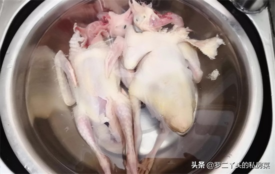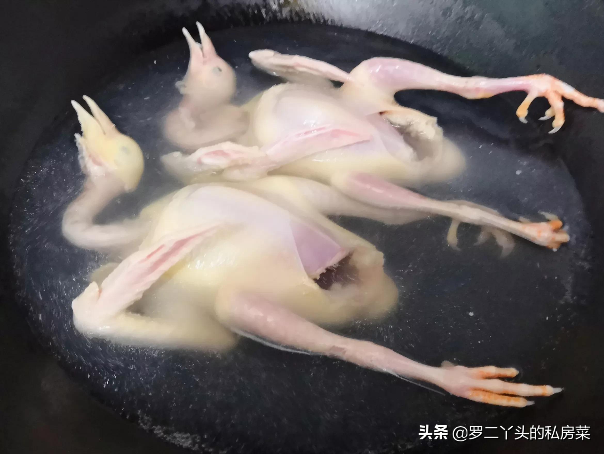 第三步:将焯好水的鸽子捞起来放入冷水里浸泡5分钟,将乳鸽毛拔干净,清洗干净;
