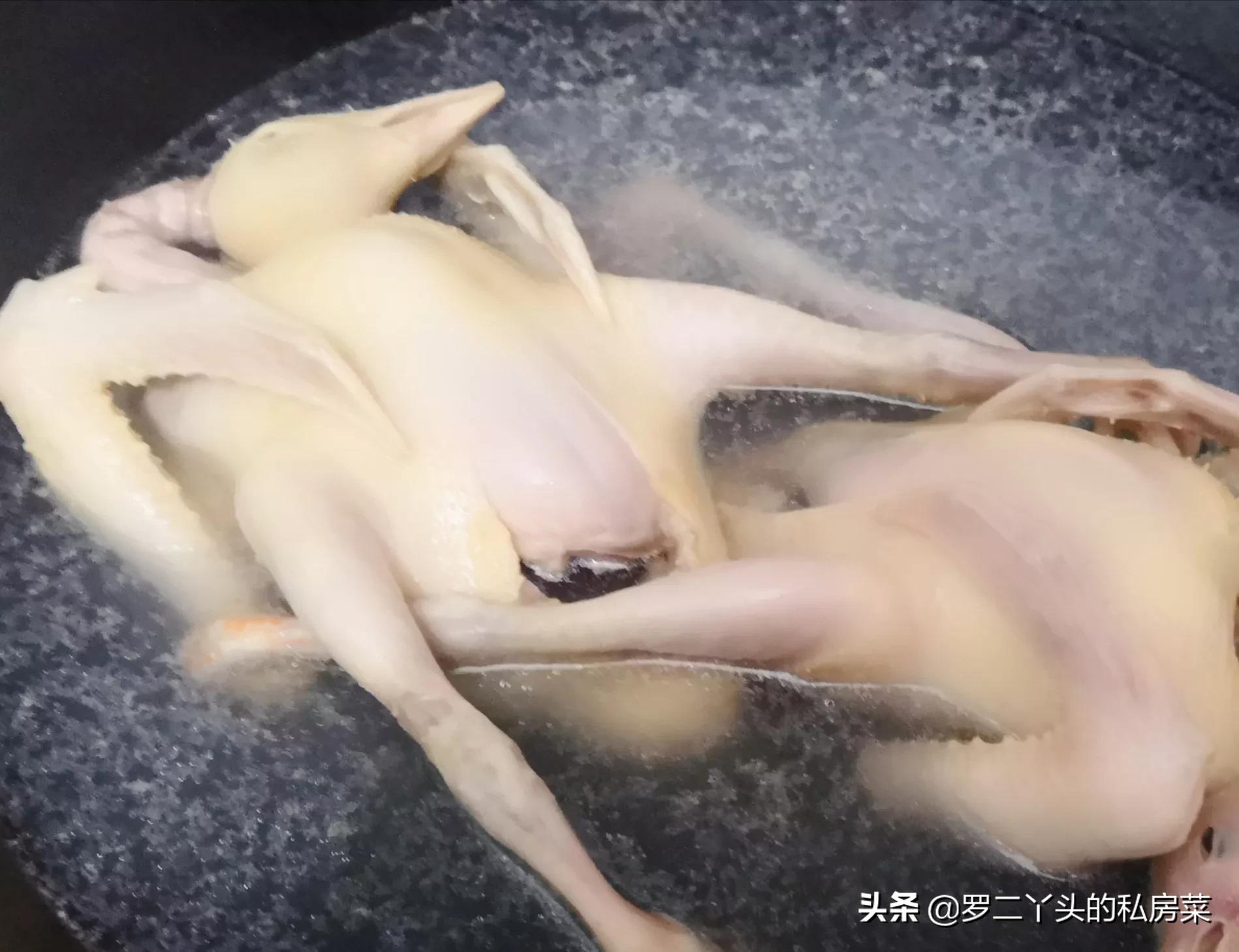 第二步:锅内放水,烧开,把鸽子焯水5分钟;焯水的时候不停地翻转鸽子,让鸽子的每个部位都被焯到水,到鸽皮变黄即可;