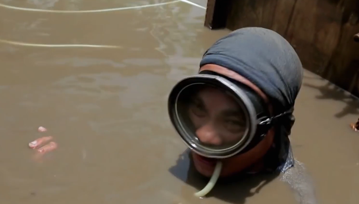 矿工的工作非常危险,而且在菲律宾是违法的,他们必须潜入水下几个小时,在矿井里面挖金子,这里的矿工没有专业的潜水设备,也没有受过专业的潜水训练,他们不是使用氧气瓶呼吸,而是将一根连接到压缩机的塑料管,作为自己的呼吸口,杰瑞米需要潜水到6米以下的底部工作,从入水到出水,他们需要在井下待上六七个小时,为了防止泥巴进入耳朵,他们需要用棉花堵住耳道。