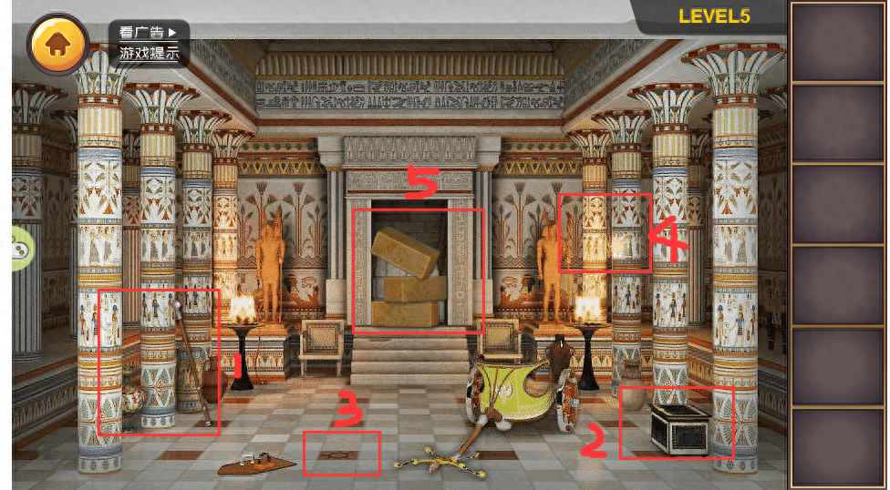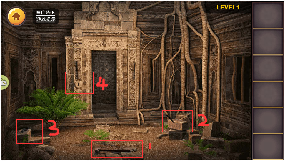 第一关:在标志1得到一把锤子,点击标志2,用锤子锤石头得到一把钥匙柄;点击标志3得到一把钥匙身,合并钥匙柄和身得到一把完整的钥匙;点击标志4,用钥匙打开门,第一关通关。
