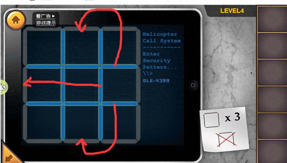 第四关:点击吧台,获得营养液一支,点击手机,摆动里面的I ,让其得到3个正方形,如图2,自动拨打电话,得到一台直升机过来救援。