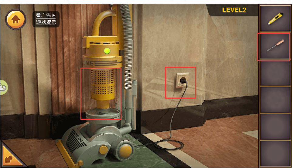 点击标志2,插孔接上电源,点击吸尘器得到一把螺丝刀身,合并螺丝刀身和柄得到一把完整的螺丝刀;