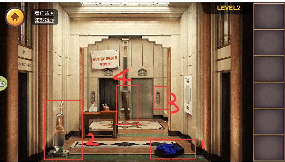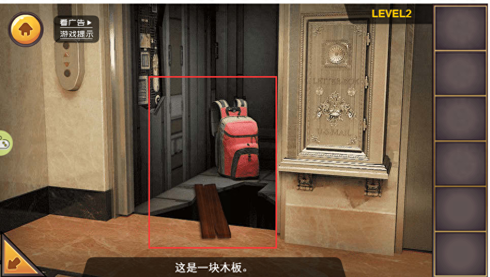 返回标志3,把遥控器放进刚才切断的电路板上,点击遥控器,电梯门打开,第二关通关。
