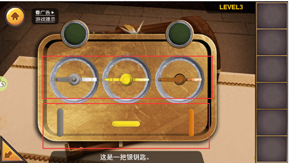 点击标志5,把三把钥匙按照颜色插进钥匙口,得到如图5,按照下面提示,左边点击一下,右边点击一下旋转钥匙,得到一把铁撬。