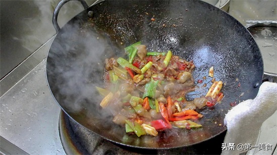 然后倒入鸡心、继续翻炒,从锅边加入少量清水