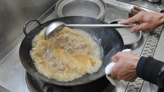 4.鸡心滑油:锅中烧油,油温烧至6成热后,倒入鸡心、滑油20秒钟捞出控油。