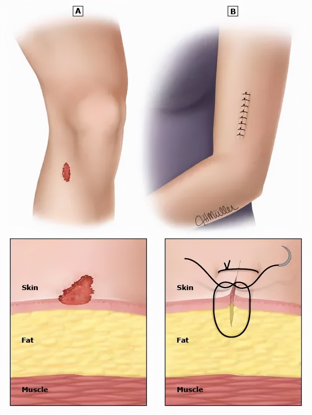 孩子皮肤外伤后,首先要做的是观察伤口,初步判断一下伤口类型。如下方示意图中的A图,伤口很表浅,没有伤及到真皮深层。这类伤口在孩子活动时,伤口两侧边缘不会移动、错开,因此通常不需要缝合。
