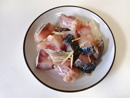 2、鱼块里放入姜丝,盐和少许白胡椒粉腌制半小时左右。有些超市也会卖腌制好的鱼块,这样自己就不用腌制了,更加省事儿。