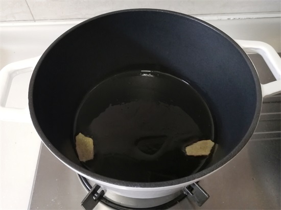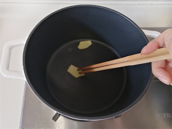 4、将锅烧热,用姜片擦锅底,这样可以在锅底形成一层保护膜,在煎鱼的时候不易粘锅,鱼不容易破。用不粘锅当然会更好。
